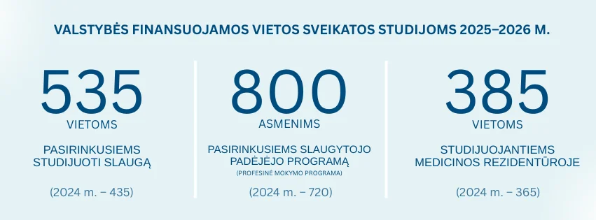 Jau suformuotas ir Švietimo, mokslo ir sporto ministerijai (ŠMSM) pateiktas 2026 metų priėmimui nacionalinės sveikatos sistemos specialistų rengimo valstybinio formavimo užsakymas, kurį ŠMSM dar derins su Vyriausybe ir Finansų ministerija. Ateinančiais mokslo metais siūloma dar didinti valstybės finansuojamų vietų skaičių pasirinkusiems slaugos (85 vietomis daugiau), visuomenės sveikatos srities (5 vietomis daugiau), dantų technologijų (10 vietų), burnos higienos (10 vietų) studijas ir slaugytojo padėjėjo profesinei mokymo programai (100 vietų daugiau).
